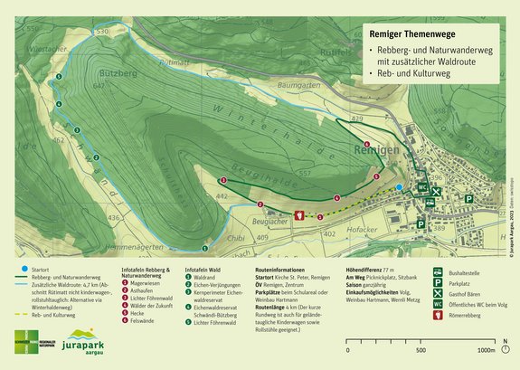 Willkommen zum Rebberg-und Naturwanderweg in Remigen. Der neue Themenweg vermittelt mit Informationstafeln viel Wissen über den Weinbau, den Wald und die Naturlandschaft rund um den Bützberg. Auf rund 43 Hektaren Wald setzt die Forstwirtschaft mehrere Naturschutzprojekte um. Vielfältige Waldränder, Altholzinseln, ein Eichenwaldreservat und ein Föhrenwaldperimeter bieten seltenen und gefährdeten Tier- und Pflanzenarten wertvolle Lebensräume. Besondere Baumarten werden hier gefördert.