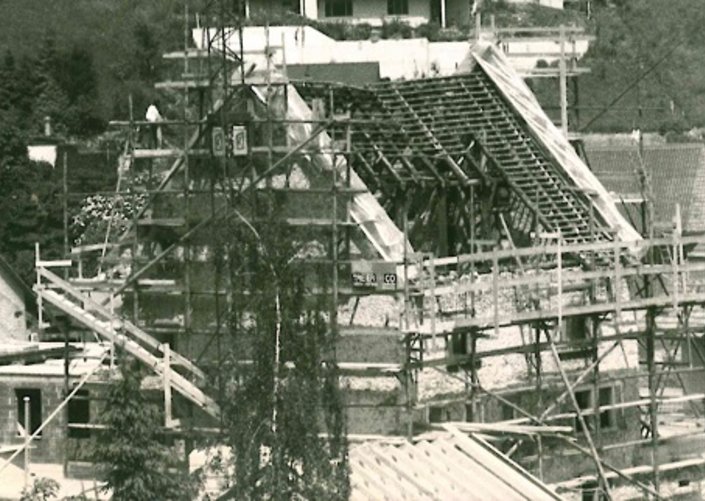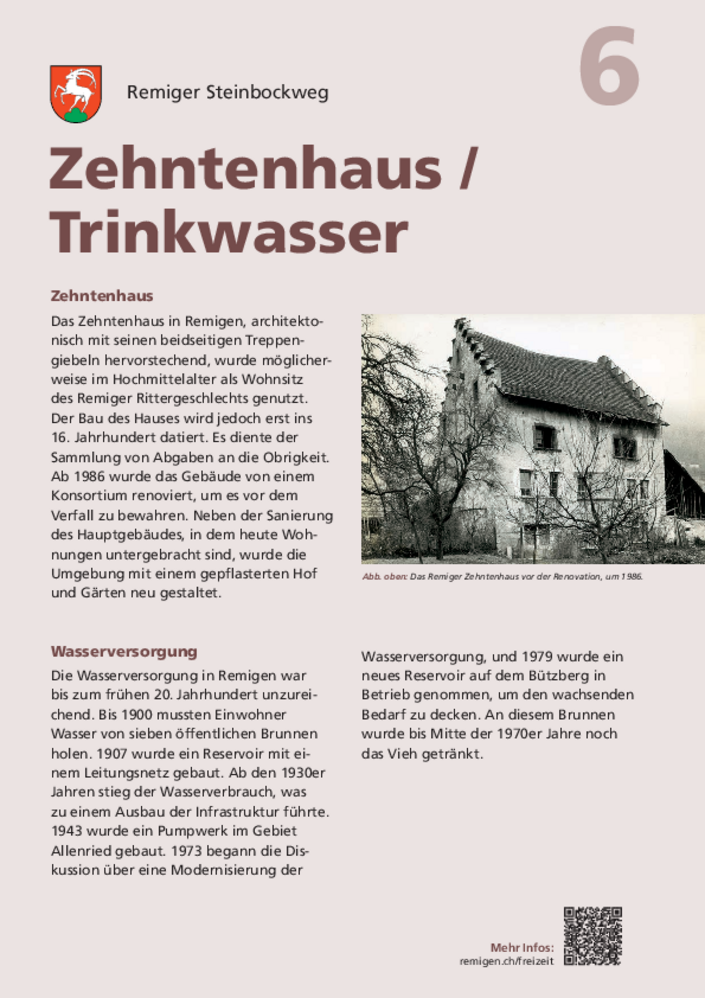 Ab der fünften Ausgabe der «Remiger Dorfzeitung» zierte ein Bild des Zehntenhauses die Titelseite. Das Wohnhaus mit den beidseitigen Treppengiebeln sticht in Remigen architektonisch hervor, bekannt darüber ist aber wenig. Möglicherweise diente das Zehntenhaus im Hochmittelalter dem Remiger Rittergeschlecht als Wohnsitz. Diesem Rittergeschlecht entstammte Heinrich von Remigen, der in den Jahren 1264–1281 Abt des Klosters Muri war. Ob das Zehntenhaus wirklich aus dieser Zeit stammt, ist nur eine Mutmassung, zumal dieser Ritterfamilie ein einstiger Burgbesitz auf dem Iberg zugeschrieben wird. 1227 siedelte die Ritterfamilie von Remigen ins neu gegründete Habsburgerstädtchen Bremgarten über. Was blieb, ist das Familienwappen dieses Geschlechts: der schreitende Steinbock, bis heute das Gemeindewappen von Remigen. Die Denkmalpflege datiert den Bau des Hauses erst ins 16. Jahrhundert. Dort wurden die Abgaben an die Obrigkeit eingesammelt. Jahrzehntelang war es still ums Zehntenhaus. Während ab den 1960er-Jahren Remigen kräftig wuchs und immer neue Quartiere erschlossen, alte Bauten abgerissen und neue erstellt wurden, änderte sich am Aussehen des Zehntenhauses nichts. Erst im Frühling 1986 wurde in der «Dorfzeitung» verkündet, dass ein Konsortium, bestehend aus drei Leuten, das Haus gekauft habe. Die neuen Besitzer wollten es renovieren und darin Wohnungen unterbringen. Um das Zehntenhaus vor dem Zerfall zu bewahren, waren zahlreiche Investitionen nötig. Zusammen mit der kantonalen Denkmalpflege packten die neuen Besitzer, zwei Handwerker aus Hausen und ein Ingenieur aus Birr, die Renovation an. Durch die Entfernung der Oberflächenverkleidung sollte die Baugeschichte untersucht werden. Erst mit der Renovation wurde die ursprüngliche Form des Gebäudes enthüllt. Die Anbauten und der aus dem 19. Jahrhundert stammende Innenausbau wurde nicht als schutzwürdig erachtet. Im Hauptbau sollten eine Fünfeinhalb-, eine Viereinhalb- und eine Zweieinhalbzimmerwohnung entstehen.