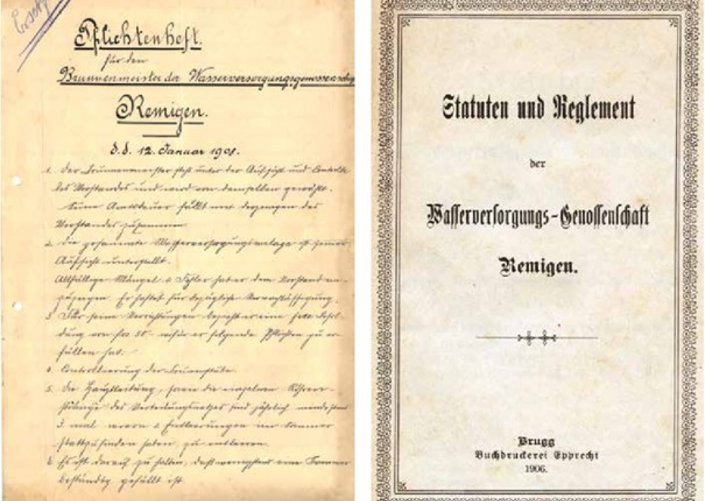 Das Wasser fliesst aus dem Hahn, wenn wir ihn öffnen. Am Morgen starten wir mit einer Dusche in den Tag, an kalten Wintersonntagen nehmen wir ein Bad und die Toilettenspülung können wir uns nicht wegdenken. Solche alltäglichen Annehmlichkeiten sind für uns selbstverständlich, egal, ob wir in der Stadt oder auf dem Land wohnen. Doch so einfach floss auch den Remigerinnen und Remigern das Wasser nicht immer zu. Bis zur Jahrhundertwende um 1900 standen sieben öffentliche Brunnen zur Verfügung, an denen die Bevölkerung Wasser beziehen konnte. Das für den Tag benötigte Wasser wurde mit Eimern ins Haus getragen und das Vieh wurde zur Tränke an den Brunnen geführt. In Trockenperioden trockneten einzelne Brunnen oft aus und die Versorgung mit genügend Wasser konnte nicht gewährleistet werden. Eine flächendeckende Trink- und Brauchwasserversorgung sollte den Lebensstandard in Remigen dereinst erheblich erhöhen. Nach geologischen Gutachten wurden 1907 ein 400 Kubikmeter umfassendes Reservoir sowie ein Leitungs- und Hydrantennetz erstellt. Neben den Vorteilen für die Remiger Haushalte konnte auch die Feuerwehr enorm von der Hydrantenanlage profitieren und Feuer effektiver bekämpfen. Trägerin dieses Projekts war die Wasserversorgungsgenossenschaft, eine Gesellschaftsform, welche in zahlreichen Schweizer Gemeinden zu Beginn des 20. Jahrhunderts zur umfassenden Versorgung des Gemeindegebiets mit Wasser zum Einsatz kam. Das Amt des Brunnenmeisters wurde geschaffen, um die Instandsetzung und Kontrolle der Wasserversorgungsanlagen sicherzustellen. Aus dem Jahr 1925 ist ein Pflichtenheft eines solchen Brunnenmeisters überliefert. Er musste einmal jährlich die Hausleitungen kontrollieren, das Reservoir reinigen sowie die Löschreserve kontrollieren. Bei den Arbeiten im Zusammenhang mit der Hydrantenanlage arbeitete der Brunnenmeister eng mit der Feuerwehr zusammen und hatte im Brandfall auch deren Anweisungen Folge zu leisten.