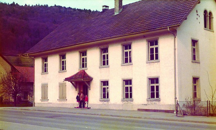 Das alte Schulhaus stand an der Gansingerstrasse, wo sich heute das ehemalige Postgebäude befindet.