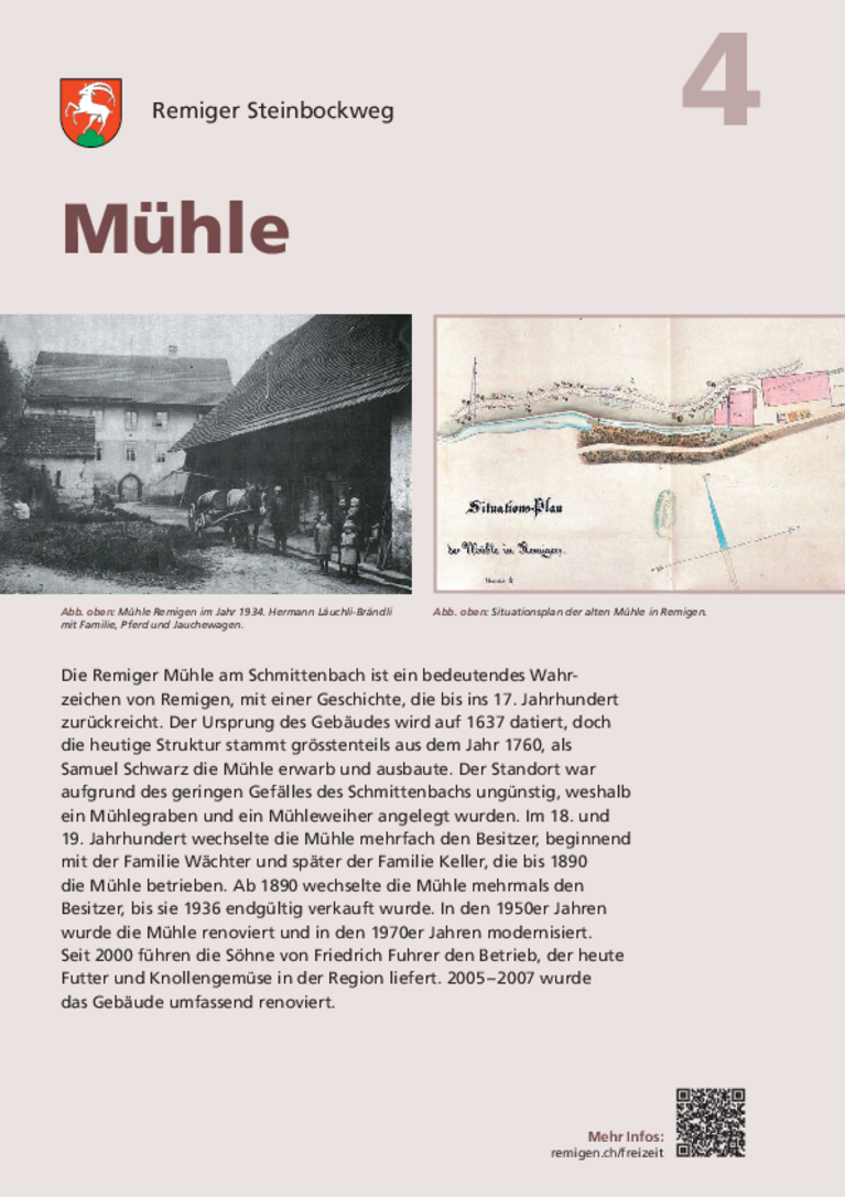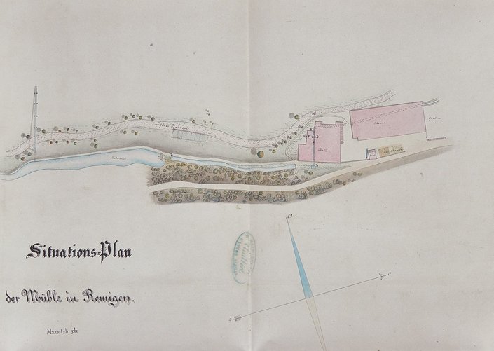Die alte Remiger Mühle am Schmittenbach im Unterdorf ist eine Konstante im Ortsbild von Remigen. Ihre seit dem 18. Jahrhundert oft wechselnden Besitzer sind dank einer Chronik des ehemaligen Obermüllers Jakob Keller (Müller von 1864 bis 1876) aus dem Jahr 1898 dokumentiert.